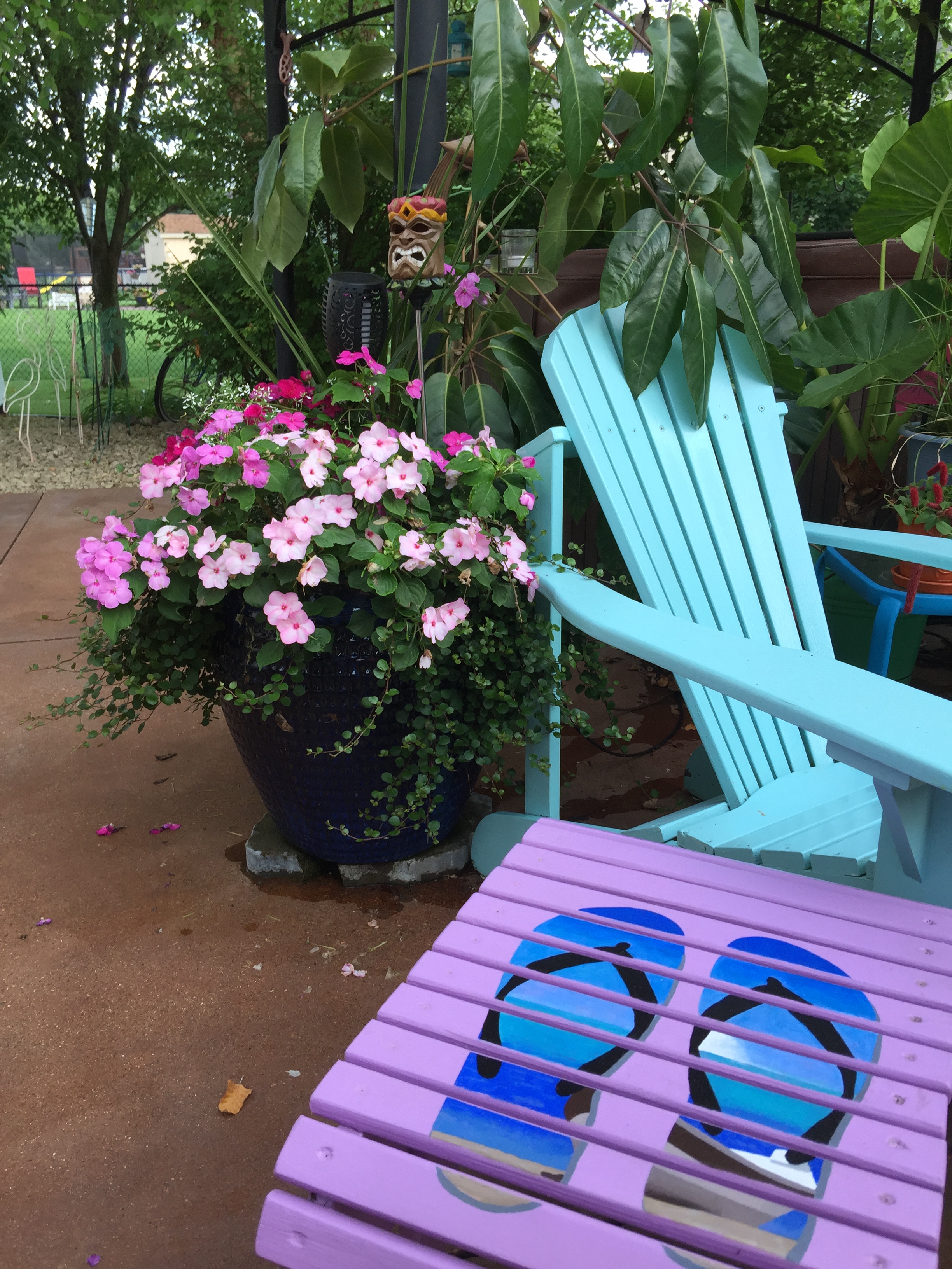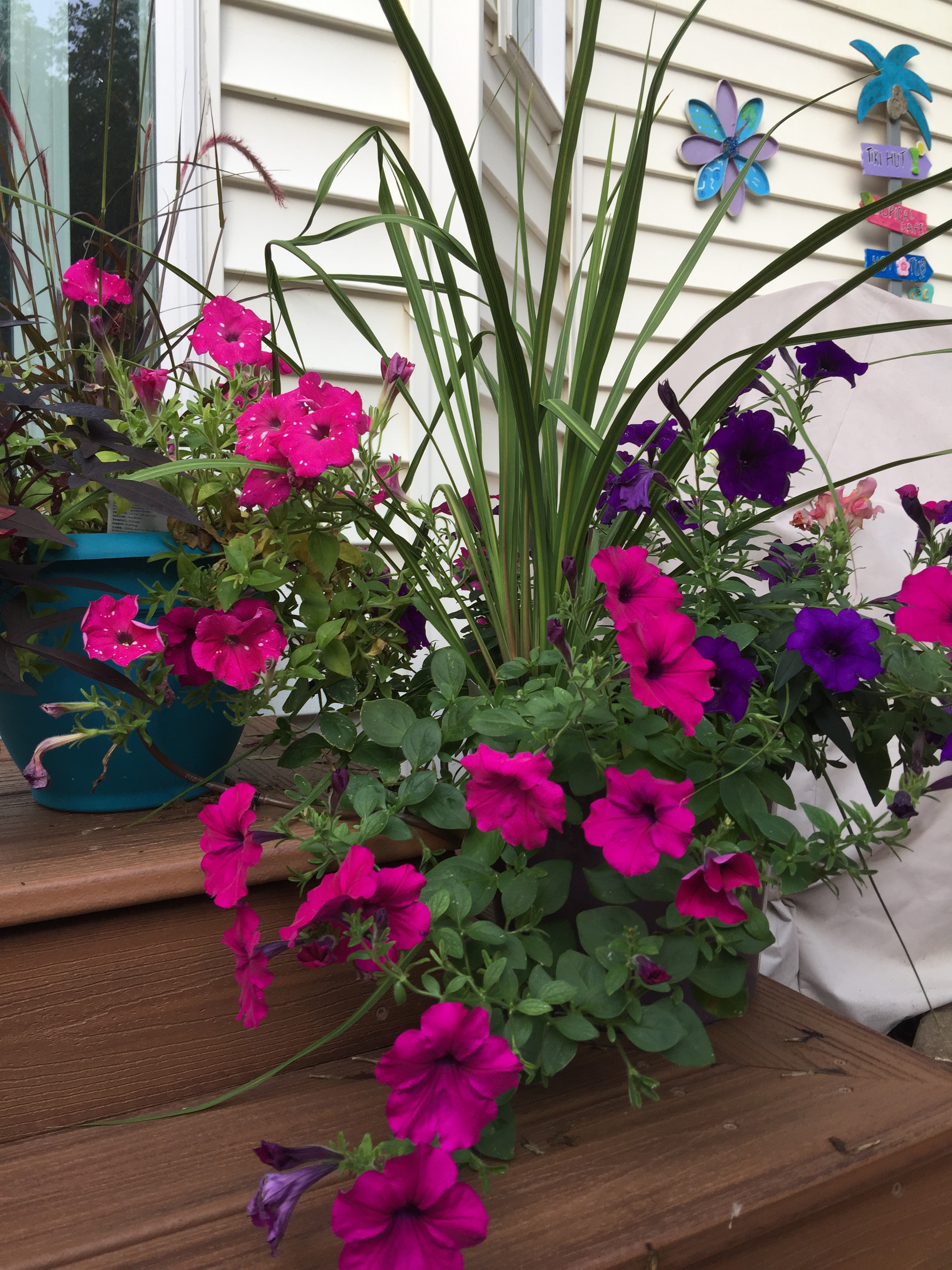 The plants are happy, getting watered consistently every day, and I don’t have to run around filling up my watering can. We even buried some PVC pipe under the grass about 4 inches down, with an elbow on each end to bring the pipe up above ground so that I can run 1/4″ tubing from the patio area through that, under the grass and into a different area that we have landscaped. In there I have a couple of other pots to water as well, and they’re now connected to the irrigation system too. So even on really hot days, if I get busy or just don’t want to be outside like last week when the heat index hit 114 degrees, it won’t matter: my system is on a timer and my plants stay happy. Can’t beat that!