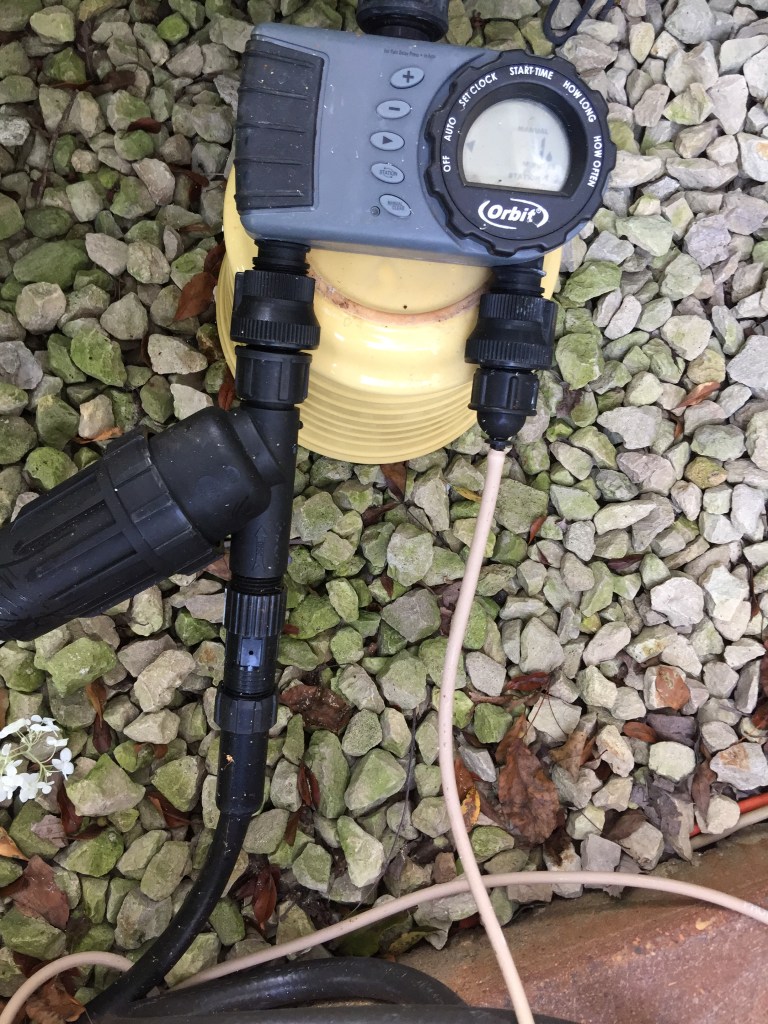 Another addition this year are some micro-spray mister heads from Rain Bird for some of my hanging pots. If I used the adjustable sprayers, it seemed like they got watered, but a lot of the water was also just running through the pot and out the bottom. With the sprayer head it seems now like it’s more evenly dispersed over the whole plant and takes longer before I have run-off of the extra.